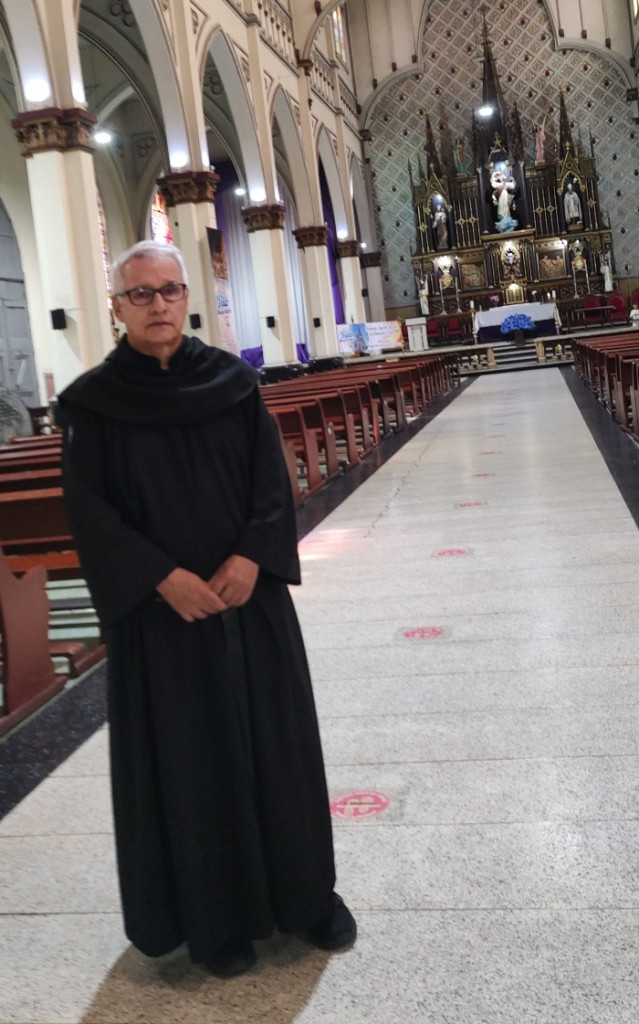 Foto | Juan Carlos Unda | LA PATRIA El sacerdote Enrique Arenas, párroco oficial de Los Agustinos o Sagrado Corazón de Jesús, tiene de marco un templo con tradición religiosa y arquitectónica