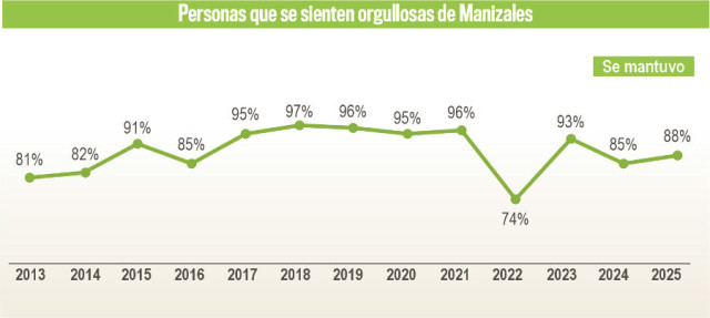 Manizales sigue siendo una buena ciudad para vivir (93%) y también hay quienes se sienten orgullosas de ella (88%).