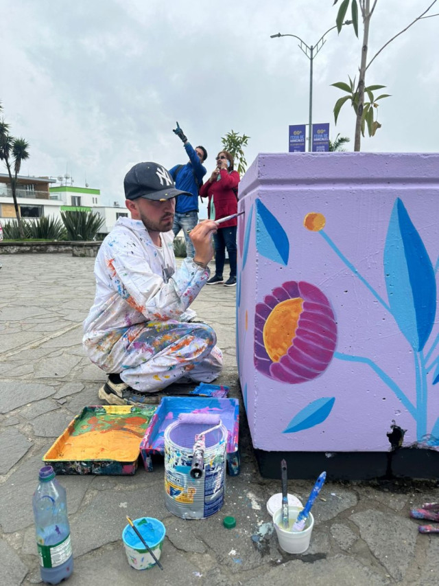 Para la intervención, indica Jaider, la técnica es mixta. “Tenemos pues pintura vinilo para exteriores coraza, que es más resistente, mezclada con aerosoles para pintar los materos”.