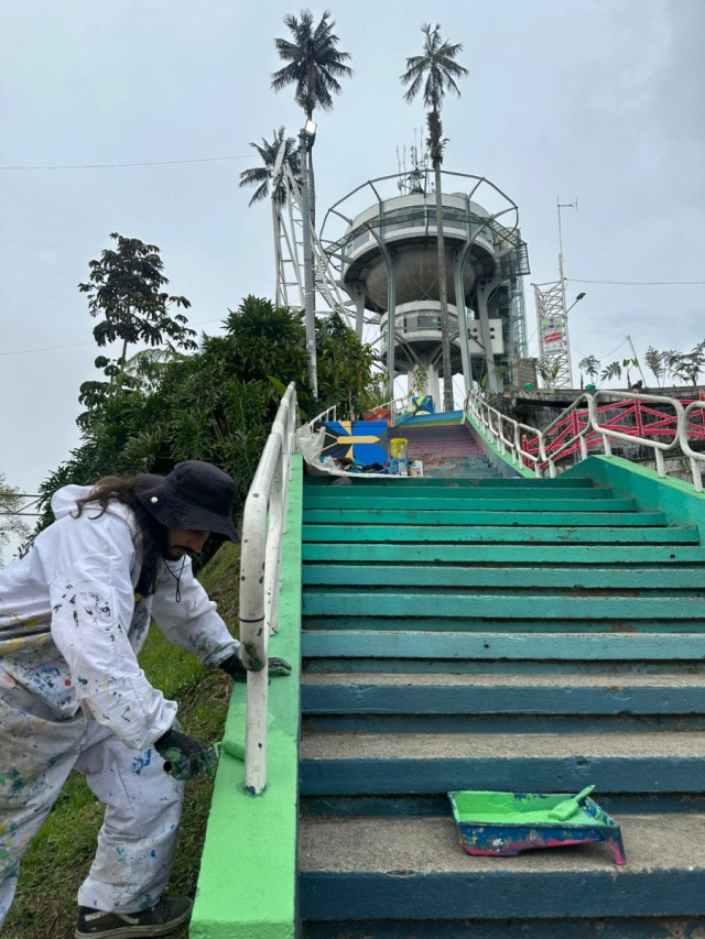 Mientras los adornos de Navidad se mezclan entre las nuevas adecuaciones en este sector turístico de la ciudad, hay tres artistas que se encargan de revivir el color de 92 escalones y 9 materos de la Torre Panorámica que el sol y el agua han ido destiñendo.