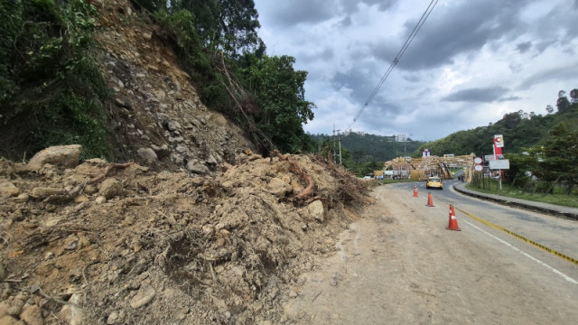 La estimación del Invías es que cayeron unos 3 mil metros cúbicos de material, incluyendo tierra y rocas de gran tamaño, algunas hasta con 1 metro de diámetro.