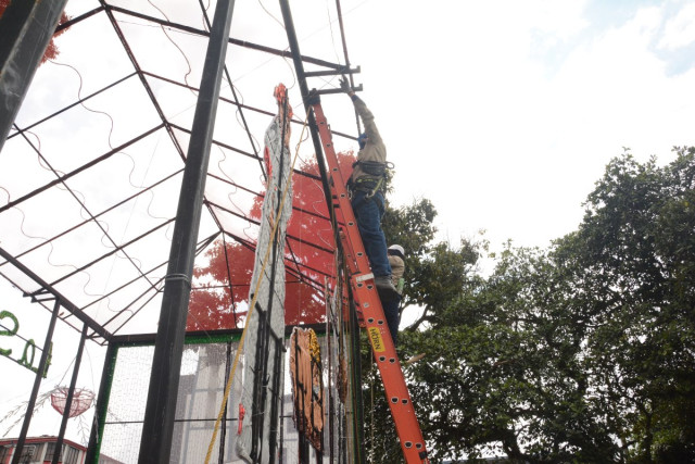 Trabajadores reconectan el alumbrado navideño del parque San José este lunes (15 de diciembre).