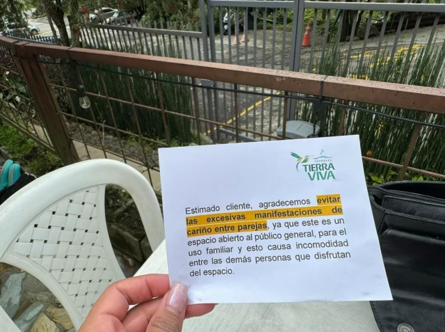 En el escrito que ellas manifiestan se lee: "Estimado cliente, agradecemos evitar las excesivas manifestaciones de cariño entre parejas, ya que este es un espacio abierto al público general, para el uso familiar y esto causa incomodidad entre las demás personas que disfrutan del espacio".