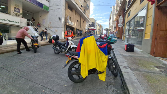 La calle 20 entre carreras 22 y 23, en donde se ubican las oficinas del Ministerio del Trabajo en Manizales, está bloqueada por motos de los repartidores. Cada 15 minutos habilitan la vía para que circule el tráfico y luego cierran de nuevo por 30 minutos.
