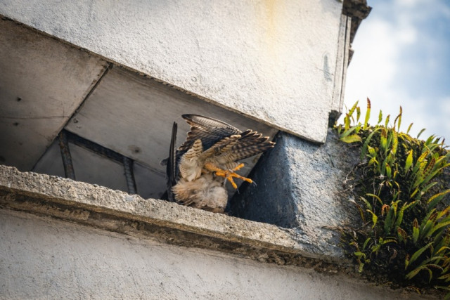 Sobre el comportamiento del ave explica: “Sale entre 6:00 y 6:15 de la tarde, se va, da la vuelta y amanece ahí. No sé si duerme ahí. Sé que es migratorio, por eso se amaña por temporadas. Siempre viene en octubre y desaparece en marzo. Se ubica solo en ese edificio, se mete allá entre ese hueco. Lo he visto volando, pero nunca cazando palomas”.