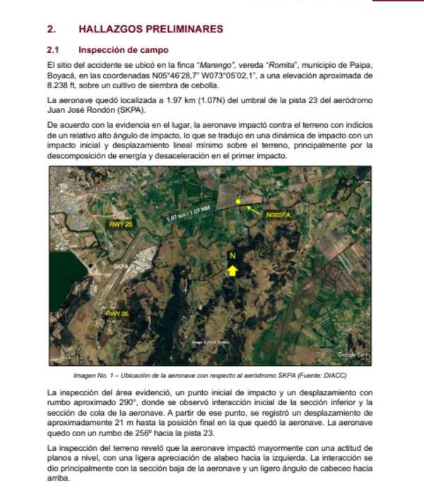 El DIACC indicó que la aeronave en la que viajaba Yeison Jiménez impactó y tuvo un desplazamiento lineal de 21 metros en la finca Marengo, vereda Romita, del municipio de Paipa.