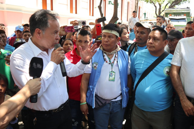El gobernador de Norte de Santander, William Villamizar (i), habla con el líder del resguardo Motilón Barí, Alexander Dora (c), y la autoridad del resguardo Motilón Barí Juan Titira en una manifestación este lunes, en Cúcuta.