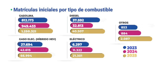 - Vehículos eléctricos: Alcanzaron 21.301 matrículas iniciales, lo que representó un crecimiento del 88% frente a las 11.322 unidades reportadas en 2024.