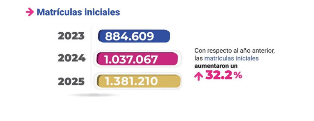 Con respecto al 2025 las matrículas iniciales aumentaron un 32%. En 2025 se registraron 1.381.210 automotores. El año antepasado se registraron 1.037.067 vehículos nuevos. 344.143 más respecto al 2024