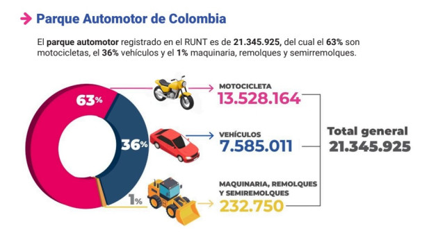 Según el informe del Registro Único Nacional de Tránsito, RUNT, el parque automotor colombiano cerró el año 2025 con un total de 21.345.925 vehículos activos en el sistema.