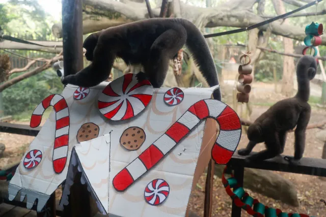 Los promotores de bienestar animal del zoológico colocaron decoraciones de cartón en cada uno de los espacios del parque que, dependiendo de la especie, tenían ocultos trozos de carne y frutas en decoraciones navideñas para incentivar la exploración.