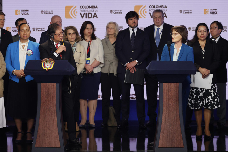 Foto | EFE - Mauricio Dueñas Castañeda | LA PATRIA El presidente de Colombia, Gustavo Petro, habla junto a Pascale Baeriswyl - Representante Permanente - Suiza, hoy durante una rueda de prensa en Bogotá.