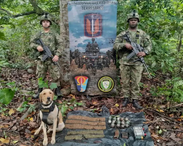 El 26 de julio este canino, en zona rural de ese mismo municipio, había localizado unas granadas y abundante munición perteneciente al Estado Mayor Central de las disidencias de la Farc.