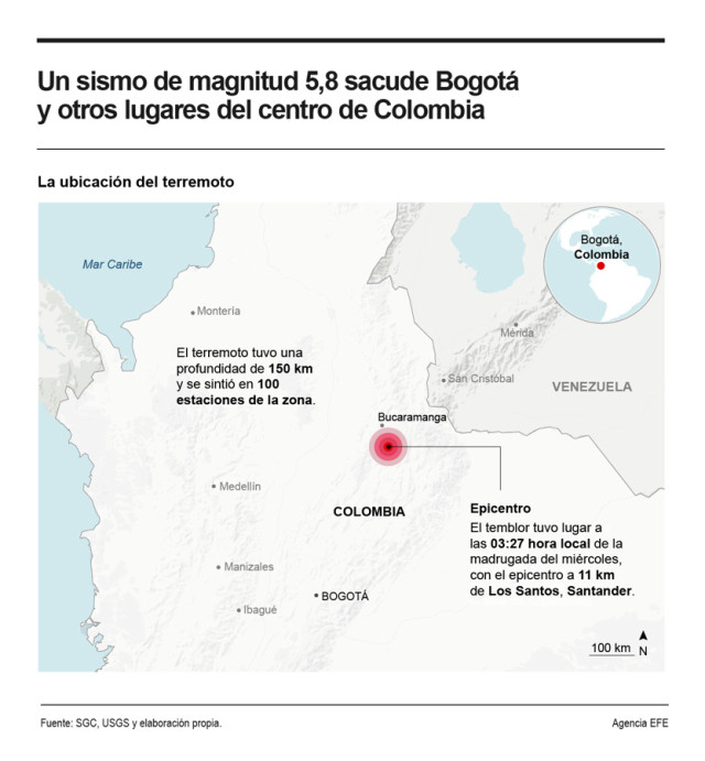 El sismo ocurrió a las 3:27 a. m. tuvo una magnitud 5.8 con epicentro en Los Santos (Santander) y una profundidad de 151 kilómetros, según el Servicio Geológico Colombiano.