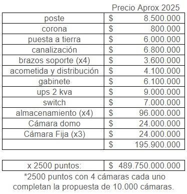 Si se parte de un ejemplo hipotético de que cada poste cuenta con una cámara domo y tres fijas, junto con todo lo que requiere para funcionar (ver cuadro) vale $195 millones 900 mil (precios del 2025), la propuesta valdría alrededor de $489 mil 750 millones (esta cifra sale de multiplicar el valor por poste por 2.500 puntos, lo que da las 10 mil cámaras).