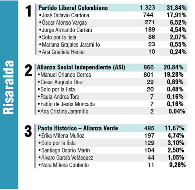 A pesar de que el Pacto histórico tuvo la lista más votada en Caldas, en este municipio del Bajo Occidente la disputa estuvo entre el Partido Liberal y la Alianza Social Independiente (ASI).