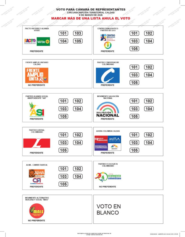 Es de circunscripción territorial. Eso significa que usted puede votar solo por los candidatos que representen al departamento, en este caso, Caldas. Al dirigirse a su puesto de votación identificará esta tarjeta con el color café. En ella encontrará listas abiertas (voto preferente) y listas cerradas (voto no preferente).