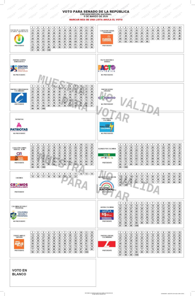 Es de circunscripción nacional. Esto significa que usted puede votar por cualquier candidato del país porque no representa a una región. Por esa razón, el tarjetón es igual en todos los departamentos. Al dirigirse a su puesto de votación, usted identificará esta tarjeta con el color azul. En ella encontrará listas abiertas (voto preferente) y listas cerradas (voto no preferente).
