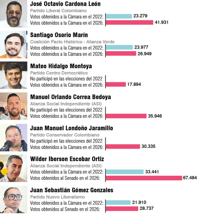 En ese sentido, José Octavio Cardona León (Partido Liberal) pasó de recaudar 23.279 votos en el 2022 a obtener 41.931 sufragios en el 2026, un aumento de 18.652 papeletas.