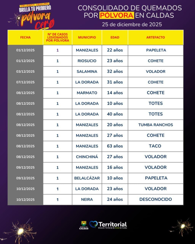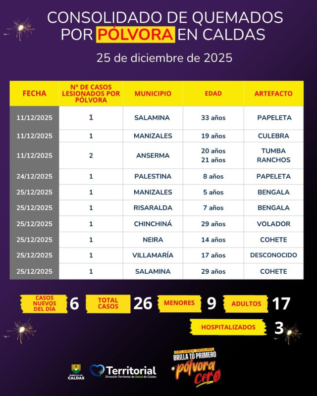 Entre el 1 y el 25 de diciembre del 2025 Caldas suma 26 quemados por pólvora.