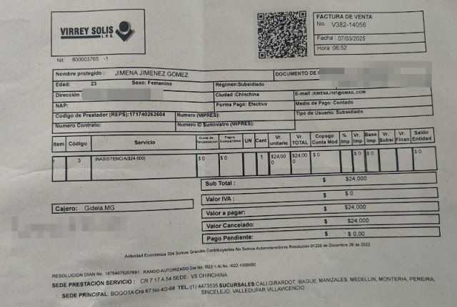Un caso reciente es el de Jimena Jiménez Gómez, residente del barrio Nuevo Horizonte, de Chinchiná (Caldas). La mujer fue rechazada en Salud Total pese a encontrarse enferma, pues -según le informaron- tenía una multa de $24 mil por una cita a la que no asistió.