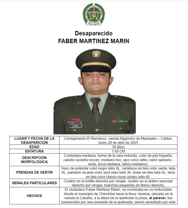 Este miércoles 14 de mayo se cumplen 17 días sin saber del paradero del policía Fáber Martínez Marín, de 38 años, desaparecido desde el lunes 28 de abril en la vereda Algarrobo (Manizales) cuando, al parecer, lo arrastró una empalizada.