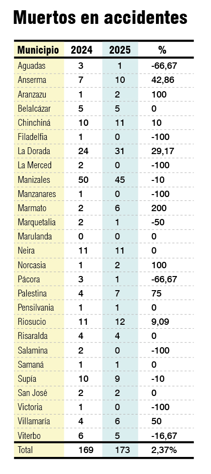 173 personas murieron en Caldas en accidentes de tránsito, 99 eran motociclistas.