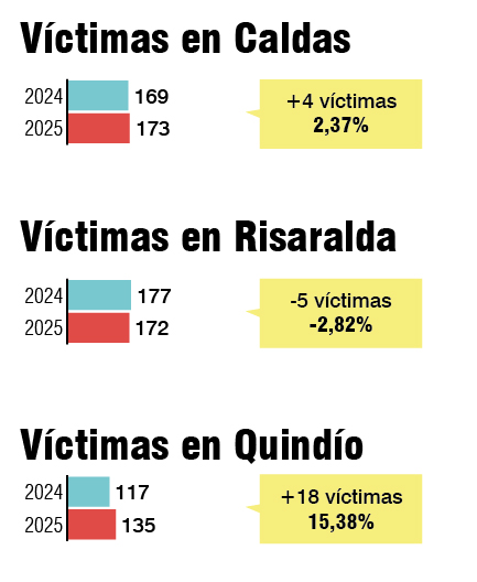 Panoramas distintos tuvieron los tres departamentos del Eje Cafetero en muertes por accidentes de tránsito durante el 2025, aunque dos estuvieron acordes a lo ocurrido en Colombia: aumentaron. El único que salvó la papeleta fue Risaralda con una disminución del 2,82%.