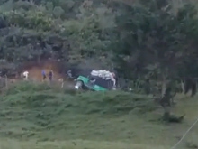 Al exceso de carga y al mal estado de la vía atribuyen este accidente del fin de semana en la vereda Encimadas, de Aguadas. El campero recoge a los pasajeros que previamente viajan en chiva y que deben trasbordar hacia el yip por la estrechez de la carretera, para poder llegar a su destino.