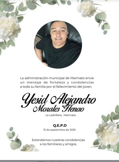 - 5. Yesid Alejandro Morales Henao, de Marmato, murió este lunes (16 de septiembre) tras chocar en su moto contra un carro y sufrir serias lesiones. El siniestro ocurrió en la Panamericana, cerca de la entrada a este municipio, vía Manizales-Medellín.