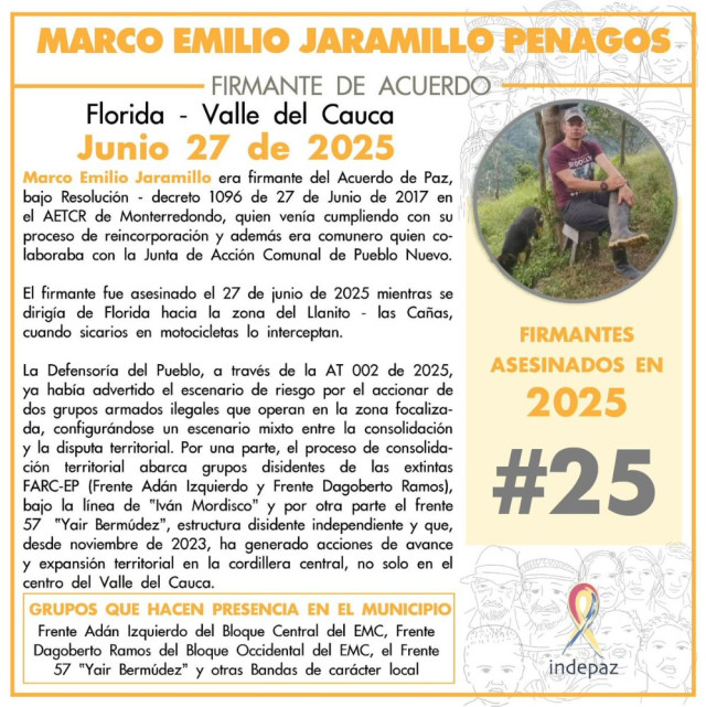 El excombatiente de las Farc, Marco Emilio Jaramillo fue asesinado por sicarios en Florida, (Valle del Cauca), informó este viernes la ONG Instituto de Estudios para el Desarrollo y la Paz (Indepaz).