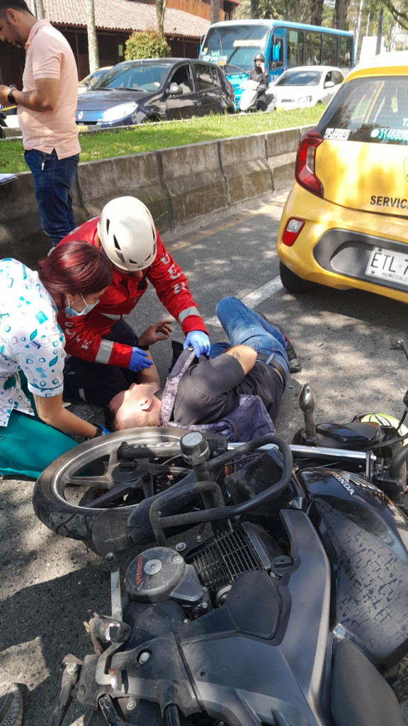 El primer caso ocurrió antes de las 11:00 a.m., cuando un vehículo colisionó contra una motocicleta en la avenida Santander con calle 65 (sector de El Cable) y le provocó heridas al conductor, Carlos Nelson Orozco Bedoya, de 33 años. El motociclista manifestó dolor en sus testículos y escoriación en la muñeca izquierda. Fue trasladado por el Grupo Especial de Rescate (GER) hacia la Clínica de La Presentación para valoración médica.