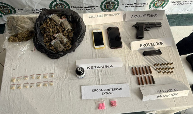 En el operativo, del que hicieron parte la Sijín, la Seccional de Inteligencia y la Fiscalía, incautaron una pistola con su cargador, 16 cartuchos 9 milímetros, 11 cartuchos 5.56, 500 gramos de bazuco, 1 frasco de ketamina, 8 pastillas de éxtasis y 2 celulares.
