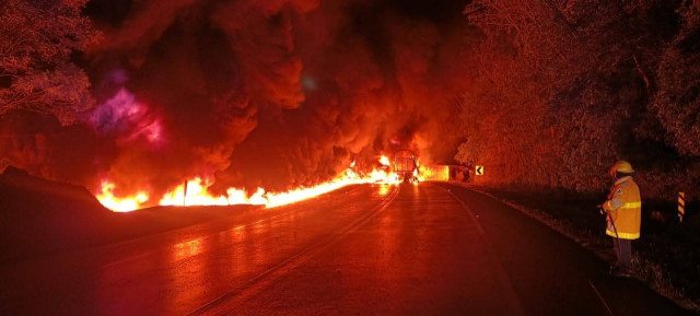 Chocaron dos tractocamiones presentándose el incendio en los vehículos.