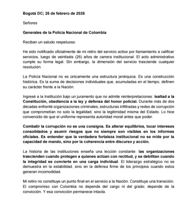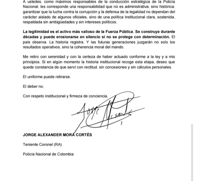- "Mi retiro no constituye un punto final en el servicio a la Nación. Constituye una transición. El compromiso con Colombia no depende del cargo ni del grado; depende de la convicción. Y esa convicción permanece intacta".