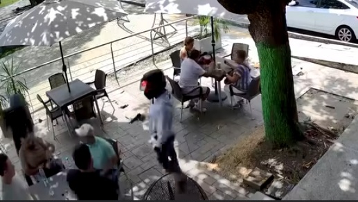 Dos hombres con armas se acercaron a una mesa a quitarles las pertenencias a unas personas.
