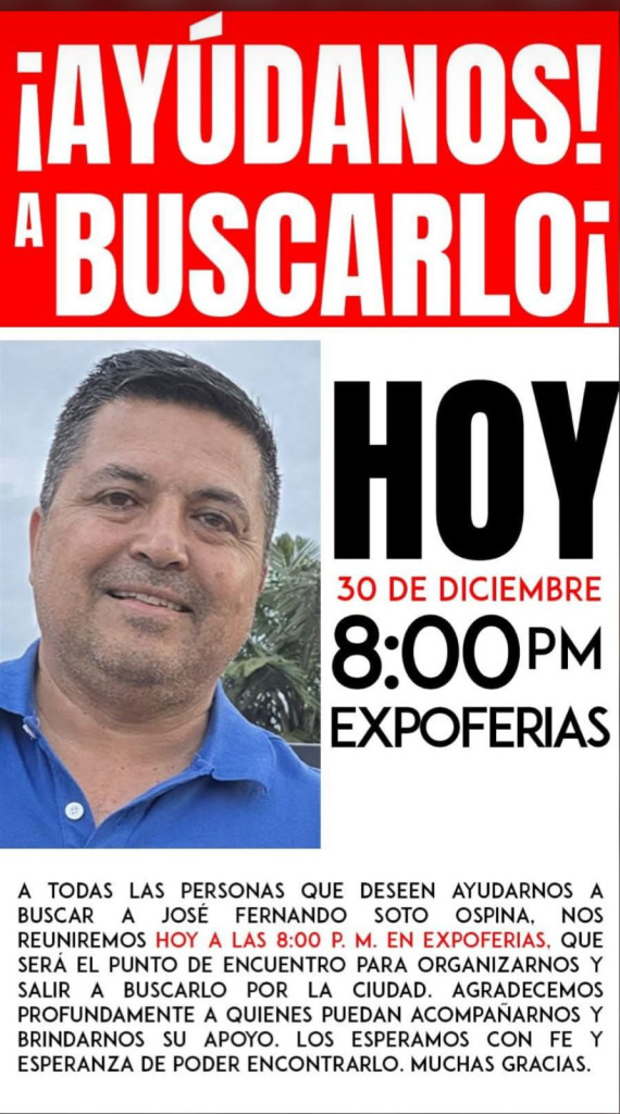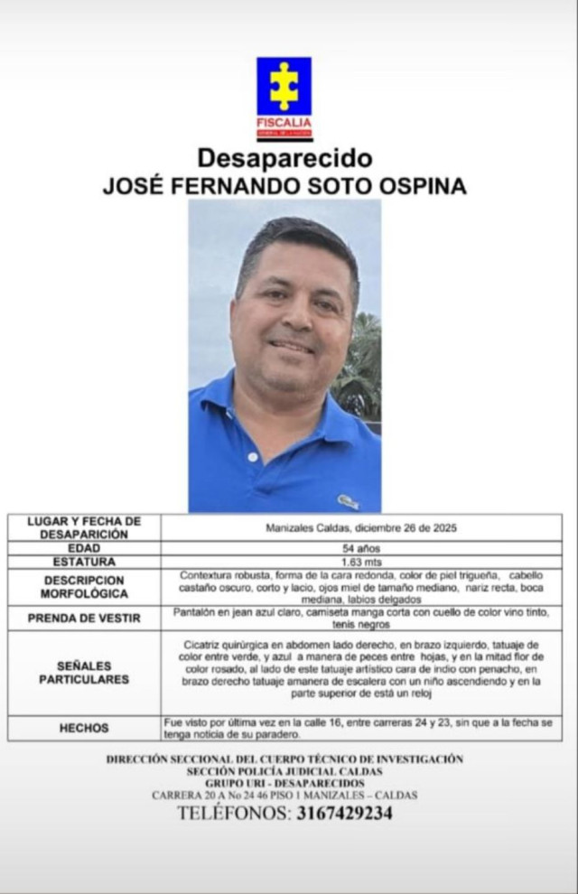 Sucesos 2025-12-30 José Fernando Soto Ospina. Autor Redacción Judicial Sigue la búsqueda incansable de José Fernando Soto, desaparecido en Manizales. Para este martes (30 de diciembre) están convocando en Expoferias para armar equipos y buscarlo por la ciudad. Se cree que anda deambulando y desorientado. Temas Destacados (etiquetas) Manizales Desaparecido