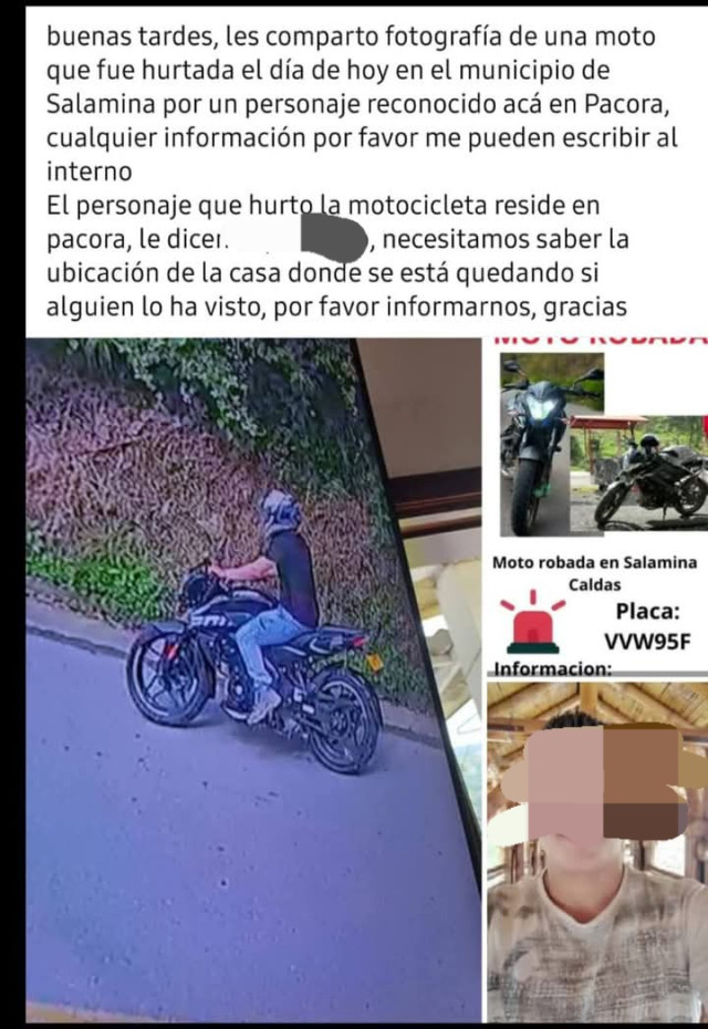 Los primeros por la presión ejercida y la segunda por dar información a las autoridades, lo que habría llevado a que el ladrón abandonara la moto en Pácora.