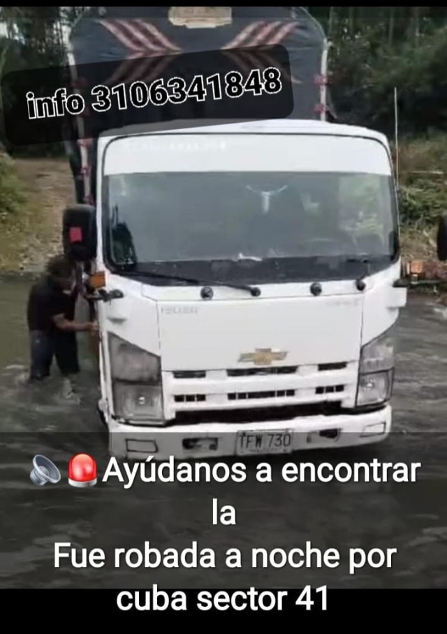 El camión hurtado es un Chevrolet NHR de estacas, con placas TFW730 de Manizales, modelo 2014. Si conoce sobre su ubicación, puede comunicarse al número 3106341848.