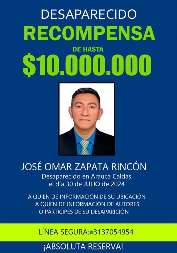 Una recompensa de $10 millones a quien brinde información sobre el paradero de José Ómar Zapata Rincón o por los posibles responsables de su desaparición, ofreció la familia del comerciante, de quien no se tiene rastro desde el 30 de julio del 2024.