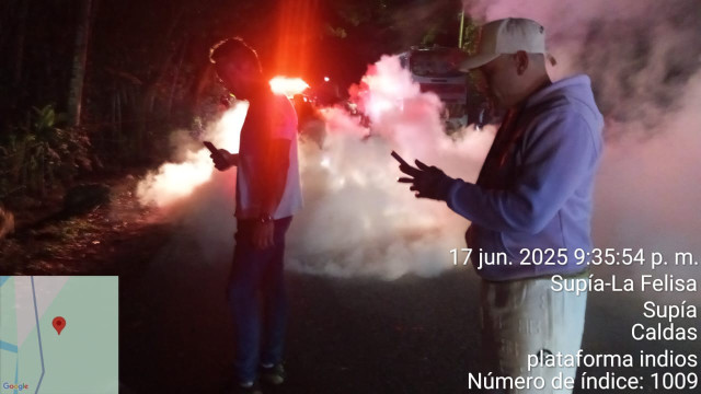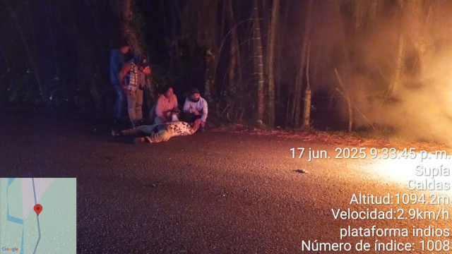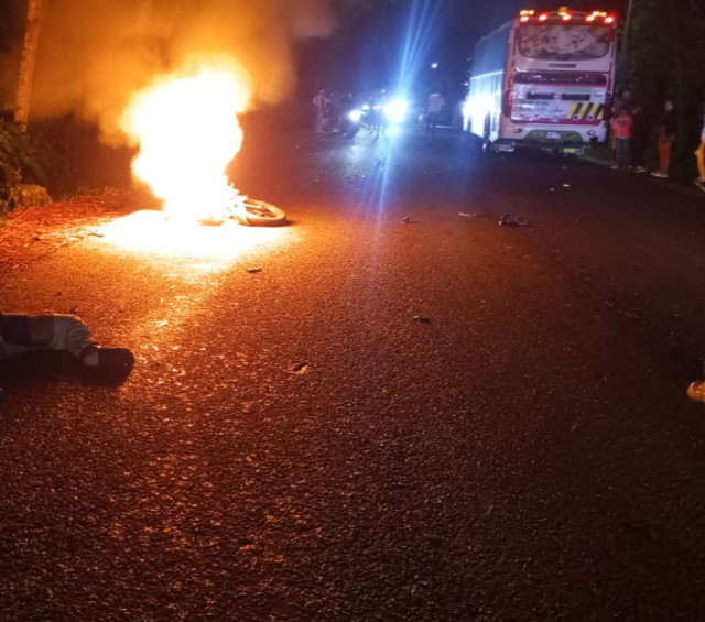 El otro en la entrada a la vereda Las Vegas, vía nacional de Supía. Una moto chocó contra un bus y el primer vehículo se incendió.
