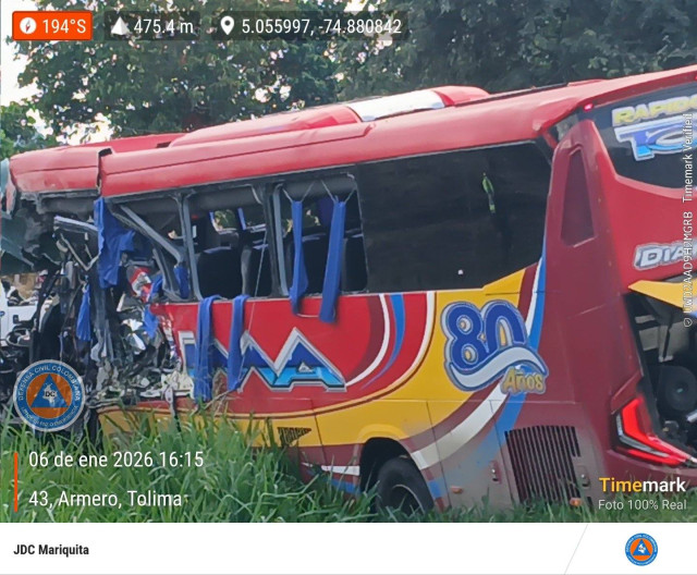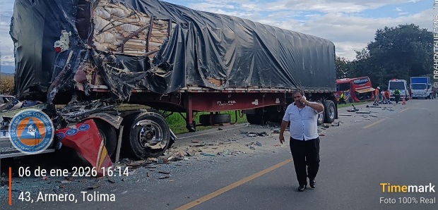 Se reportan dos personas fallecidas y 15 heridas cuando un bus afiliado a la empresa Rápido Tolima, de placa KZL900, chocó con un tractocamión, de placa TRJ-447.