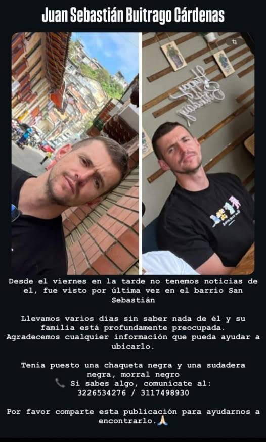 Juan Sebastián Buitrago Cárdenas. Si sabe su paradero, puede llamar al 123 o avisar al CAI más cercano.