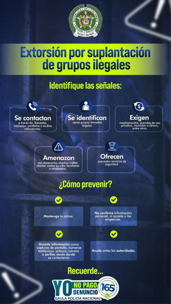 No pague las extorsiones, dé a conocer los hechos a las autoridades y llame a la línea 165 del Gaula donde lo orientaran sobre lo que debe hacer.