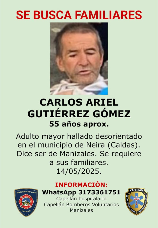 Se trata de Carlos Ariel Gutiérrez Gómez, de 55 años. El 14 de mayo pasado había sido reportado en Neira como una persona que deambulaba, desorientada, y decía ser de Manizales.