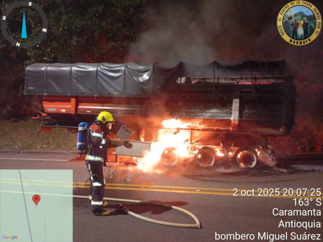 Apoyo al Cuerpo de Bomberos Voluntarios de Marmato en incendio vehicular en la vía de Concesión Pacífico 3, antiguo peaje Supía, donde se incendió la parte trasera de un camión.