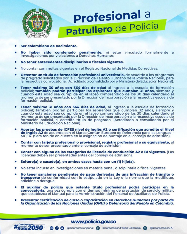 Convocan a ser parte de la Policía. Debe se colombiano de nacimiento, no haber sido condenado penalmente, ni estar vinculado formalmente a investigaciones por violaciones a Derechos Humanos. Carecer de antecedentes disciplinarios o fiscales vigentes.