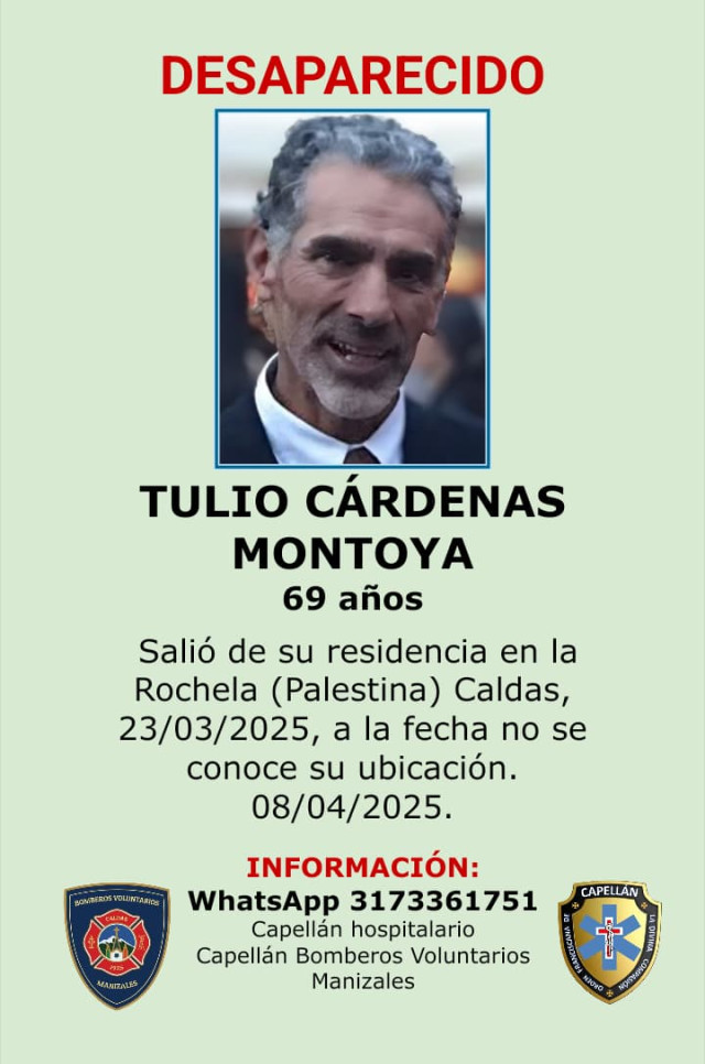 Lo que se sabe es que Tulio Cárdenas Montaña, de 69 años, salió de su casa ubicada en La Rochela (Palestina) ese día y desde eso le perdieron el rastro.