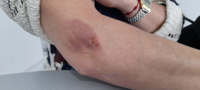 El moretón en el ojo izquierdo de la afectada y el golpe en el brazo derecho. Presentaba dificultad para abrirlo, además de expresar que el dolor de cabeza era fuerte.