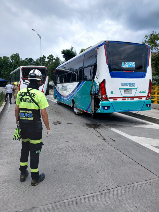 12:30 p.m. Glorieta de Los Cedros, sentido Mall Plaza, chocan dos buses de servicio público. Sin lesionados. Acudió ByR.